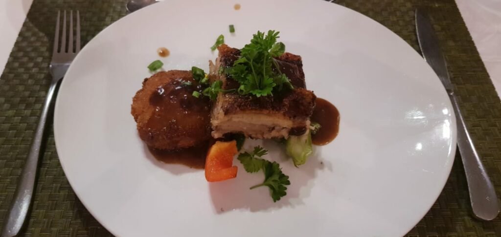 The starter was a delicious selection of fresh sashimi with avocado, salad, soy and wasabi, just perfect. One of the main dishes we ordered was crispy pork with sweet potato croquette on a vegetable mattress, delicious. The other was fish, also with breaded sweet potato croquette, steamed vegetables and coriander.